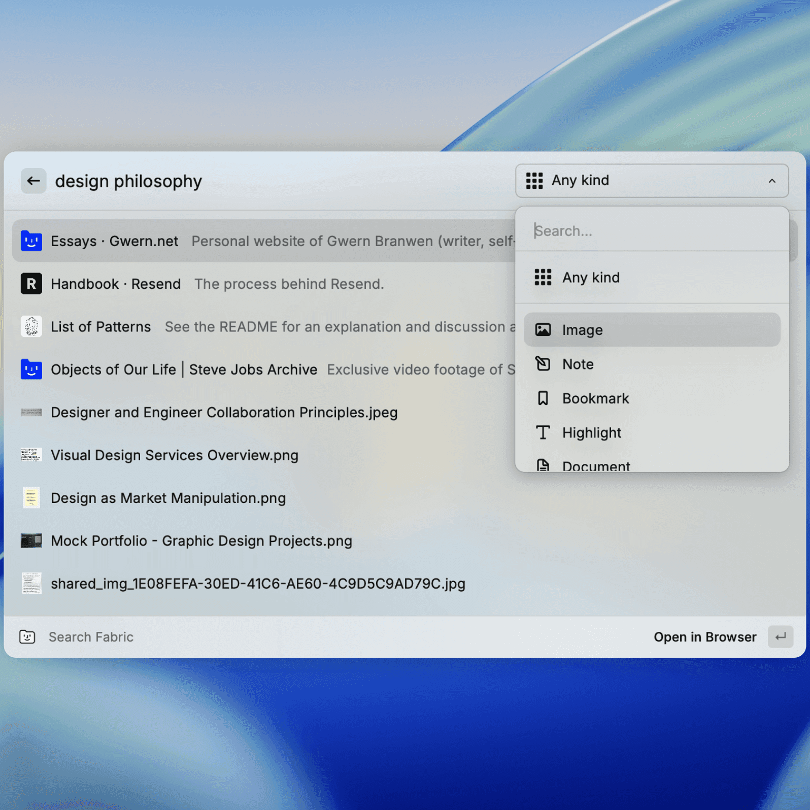 Fabric will search all your connected apps, clouds and anything you've saved or created in your Fabric. Find things in the way that your brain actually works.