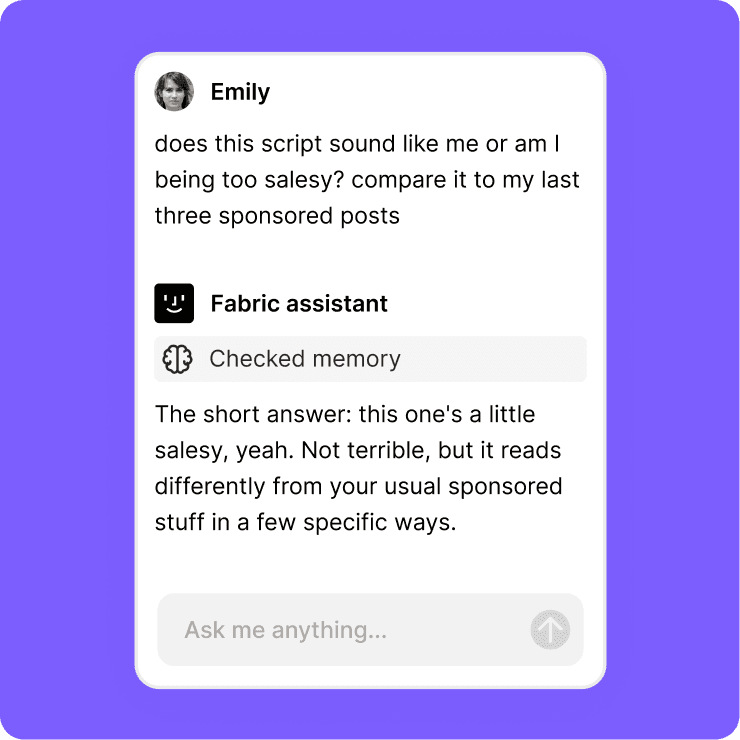 Draft hooks from your research, summarize a brand brief, rewrite a caption, or find that clip from three projects ago.