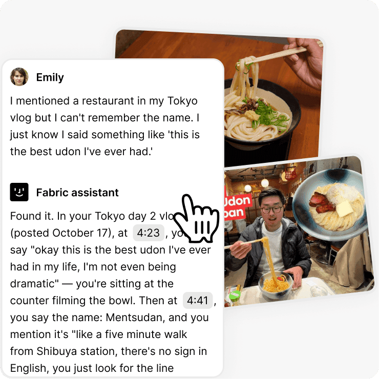 Fabric searches your transcripts automatically. Find the exact moment in a recording where you talked about a specific idea or topic.