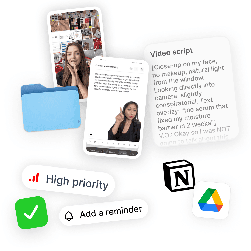 Scripts, PDFs, images, video, audio, links, bookmarks, TikToks, Reels, YouTube drafts. Import from Google Drive, Notion, or Dropbox.