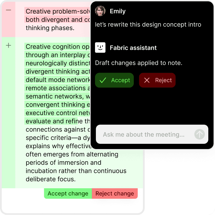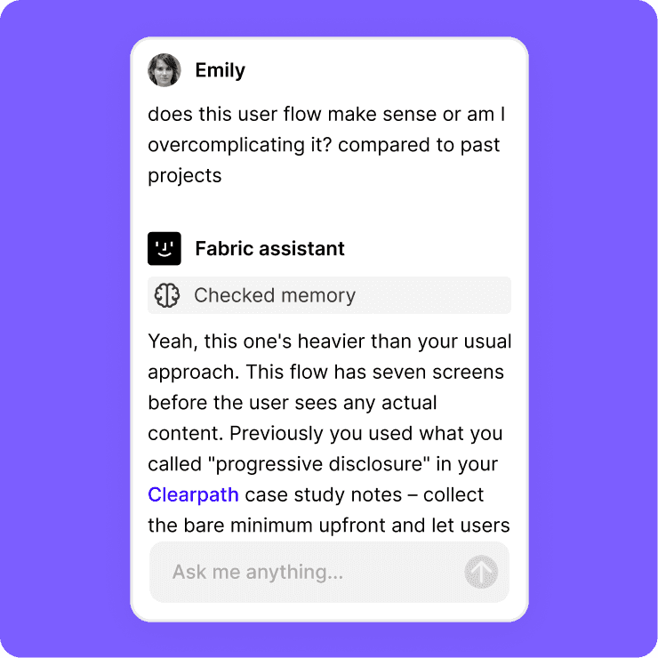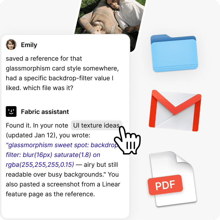 With powerful memory, the more you add to Fabric, the more your assistant can do for you. Your projects, your references, your style.