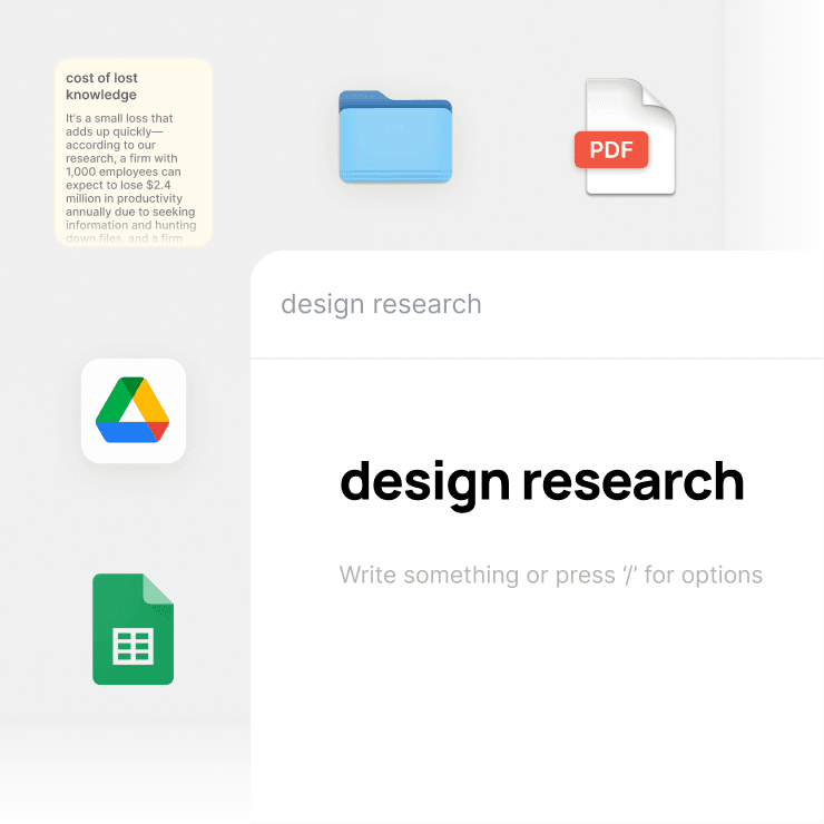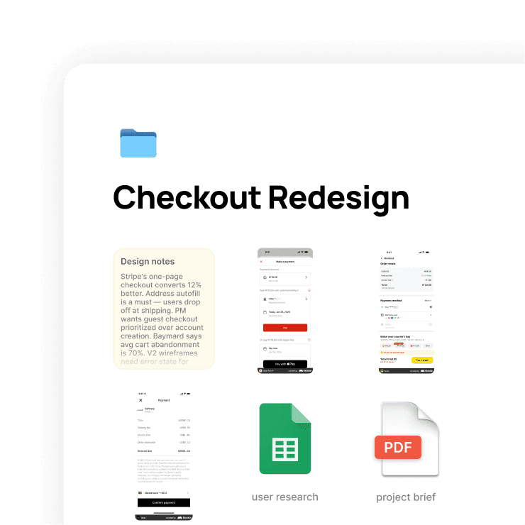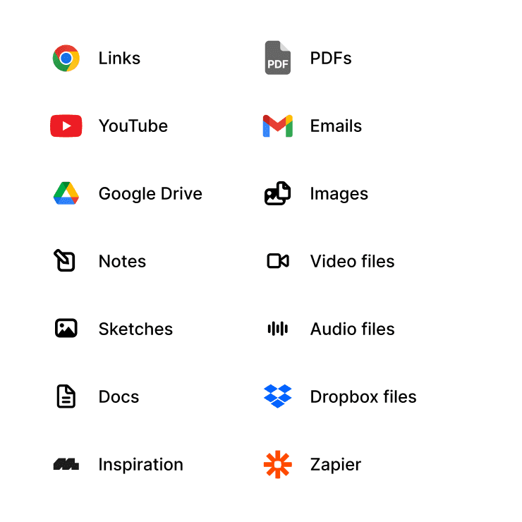 PSDs, PDFs, images, video, sketches, links, bookmarks, Figma files, presentations. Import from Google Drive, Notion, or Dropbox.